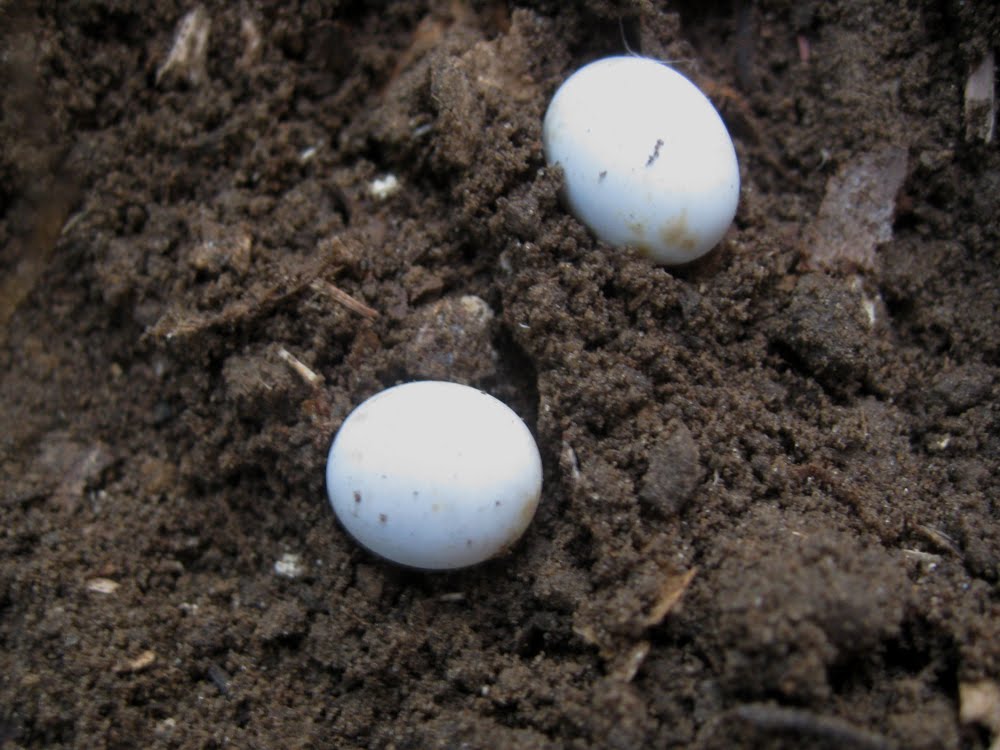 Tilly eventually woke up and got rolled away from the hole and I was finally able to get that spicebush in....but as I was covering it with dirt, I managed to uncover a couple little eggs that were next to a rotten old hickory log. For some odd reason, I just assumed they were bug eggs and put them back where I thought they came from and covered them with about an inch of dirt (they were about 3/4" long and didn't feel like the hard shell of a bird egg, more like a thick-walled balloon). When I thought about it long enough once I got home, I realized no bug was big enough to shoot out eggs that size (!!!) so I then thought perhaps the eggs were turtle eggs....but they were so lightweight and kind of small for a turtle, even a little one. Dick suggested they might be 'possum eggs (!!!!!!) but I'm just going to assume they're snake eggs, only because I don't know what else they could be (but I can confidently say they did not come out of a 'possum-hahaha!).